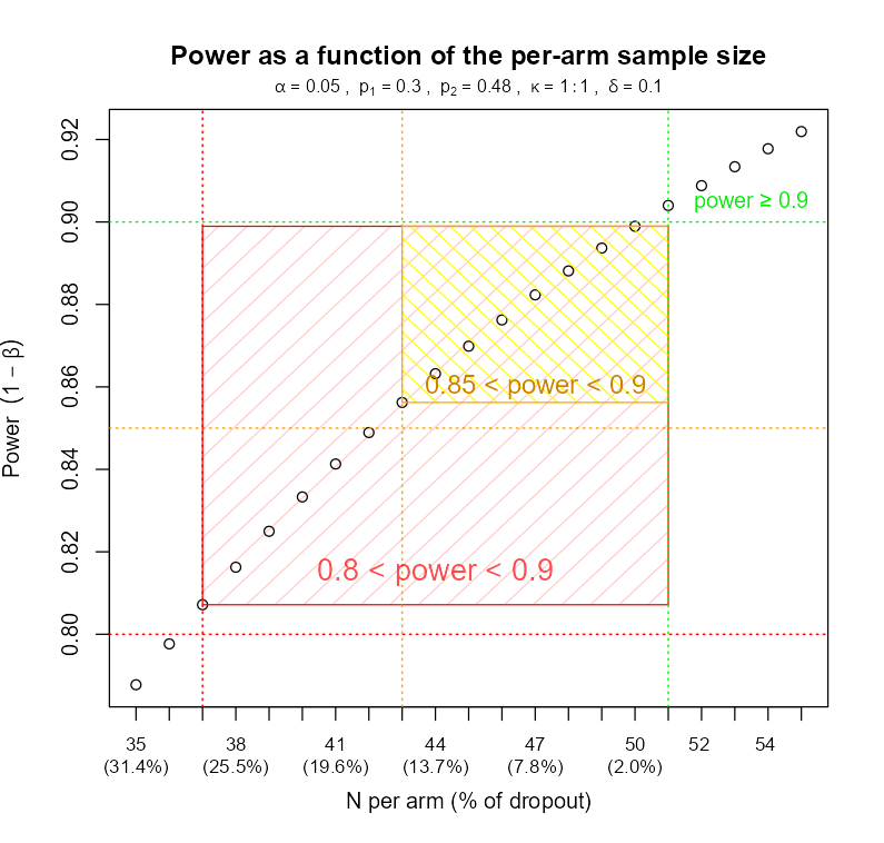 Warto w tym miejscu uzupełnić, że analizy takie często mają postać analiz „co-jeśli”, gdzie przedstawia się kilka możliwych scenariuszy, np. dla różnych rozmiarów efektu, dla różnych poziomów mocy i odsetka pacjentów, którzy mogą zostać utraceni w badaniu (lost to follow-up, drop-outs). Taka analiza jest cenna, ponieważ pozwala zorientować się zawczasu w możliwych zagrożeniach, w tym, m.in. jak wielu pacjentów może zostać utraconych, zanim procedury utracą minimalną moc 80% oraz zaplanować ewentualne uzupełnienie ich liczby przez dodatkowe rekrutacje.