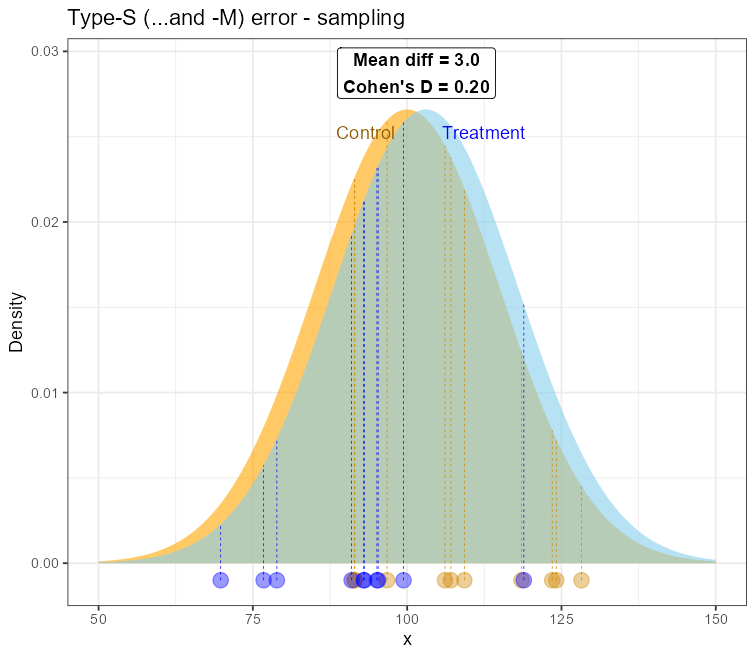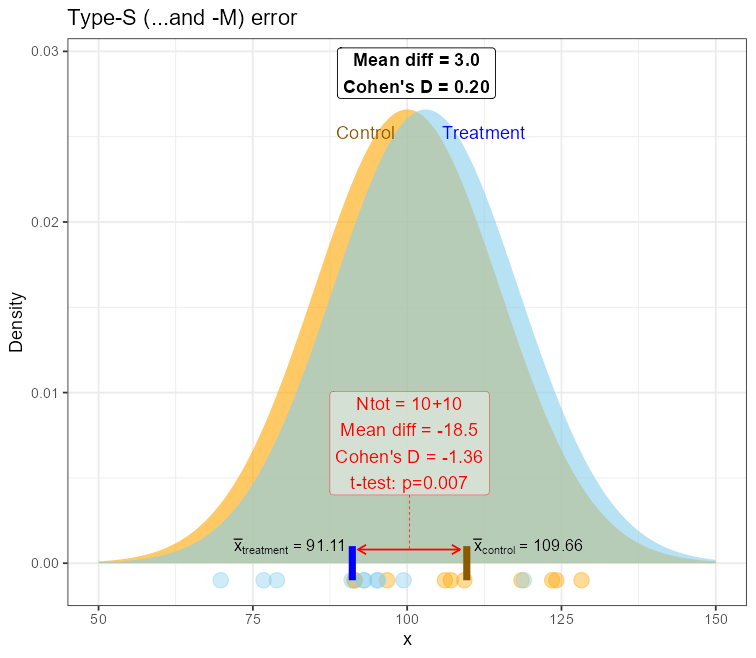 Brak lub niepoprawnie przeprowadzona analiza mocy (lub ekwiwalentnie minimalnej liczebności próby) prowadzić może do badań określanych z angielska jako „underpowered”. Wedle moich obserwacji dość powszechnie uważa się, iż brak mocy do wykrycia potencjalnie interesującego efektu jest jedyną konsekwencją. Niestety, konsekwencje mogą być znacznie gorsze i w zupełnie nieoczekiwanym kierunku! Chodzi o błąd typu M i S, od angielskich słów Magnitude – błąd rozmiaru efektu oraz Sign – błąd znaku efektu. Otóż w bardzo małych próbach (N=10-40 obserwacji), szczególnie przy restrykcyjnych warunkach włączenia / wyłączenia z badania, istnieje ryzyko wylosowania obserwacji bliżej „ogonów” rozkładów – a zatem o wartościach bardziej ekstremalnych a jednocześnie rzadziej występujących. Wpływ takich obserwacji na średnią jest znacznie większy w małych próbach niż w większych. Oznacza to, że nawet dla niezbyt ekstremalnych wartości średnia z obu porównywanych grup mogą znacznie oddalić się od siebie, prowadząc do efektu: